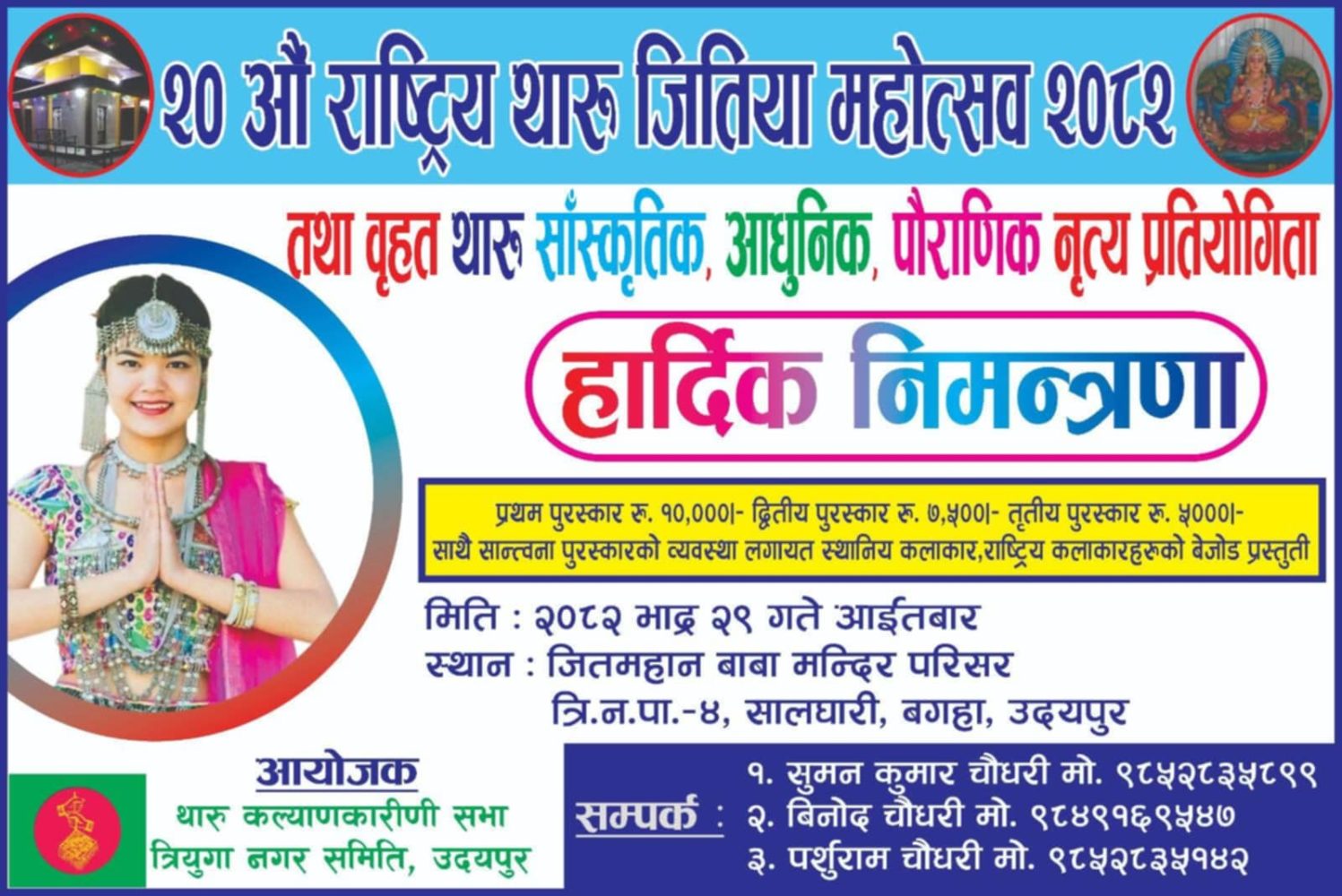 उदयपुर,भाद्र १९— उदयपुरको त्रियुगा नगरपालिका–४, सालधारी, बगहा स्थित जितमहान बाबा मन्दिर परिसरमा आउँदो २०८२ साल भदौ २९ गते आइतबार को दिन भव्य रूपमा २०औं राष्ट्रिय थारु जितिया महोत्सव आयोजना हुने भएको छ।